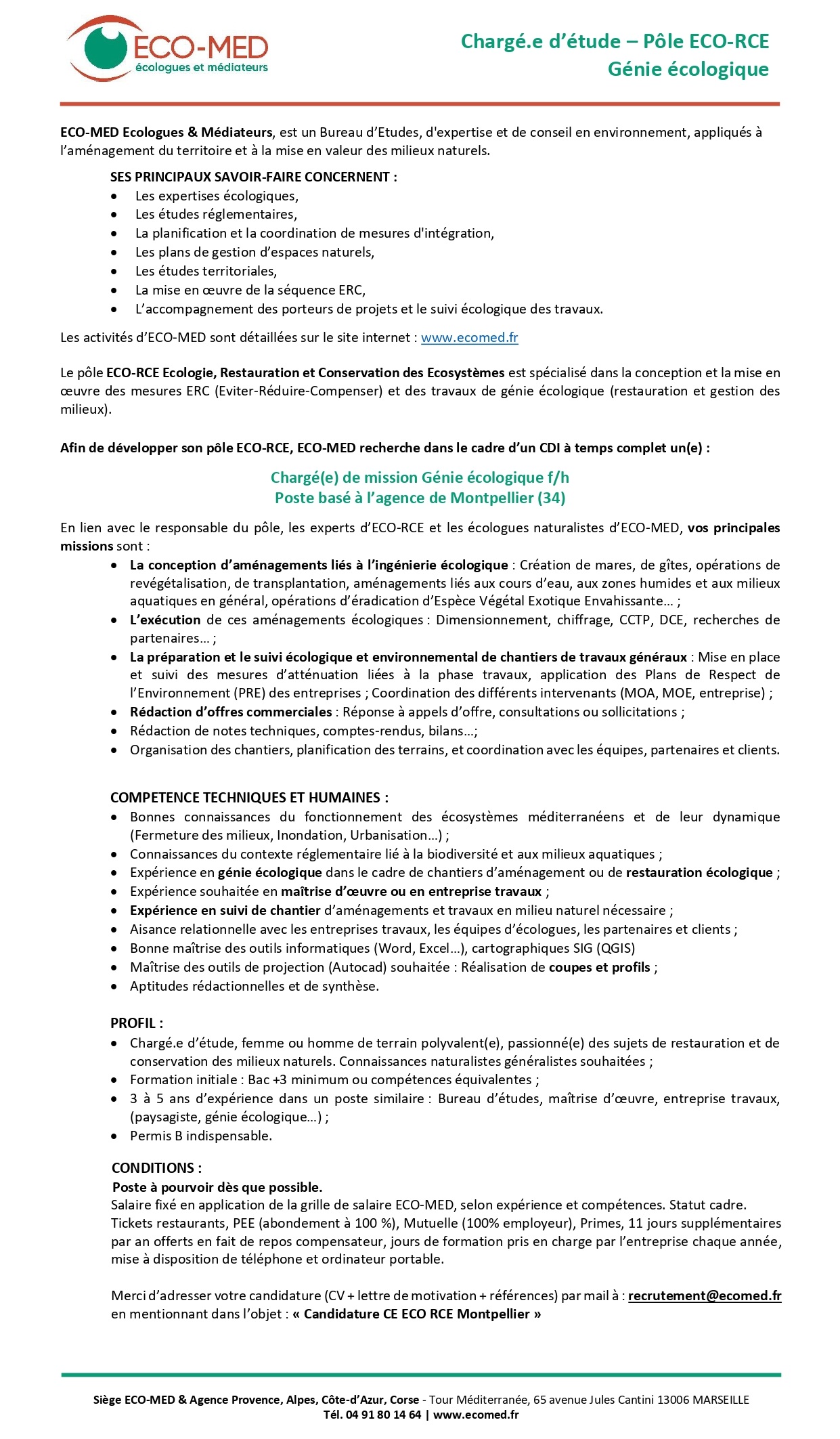 CHARGE(E) DE MISSION GENIE ECOLOGIQUE – F/H – Poste basé à Marseille (13)