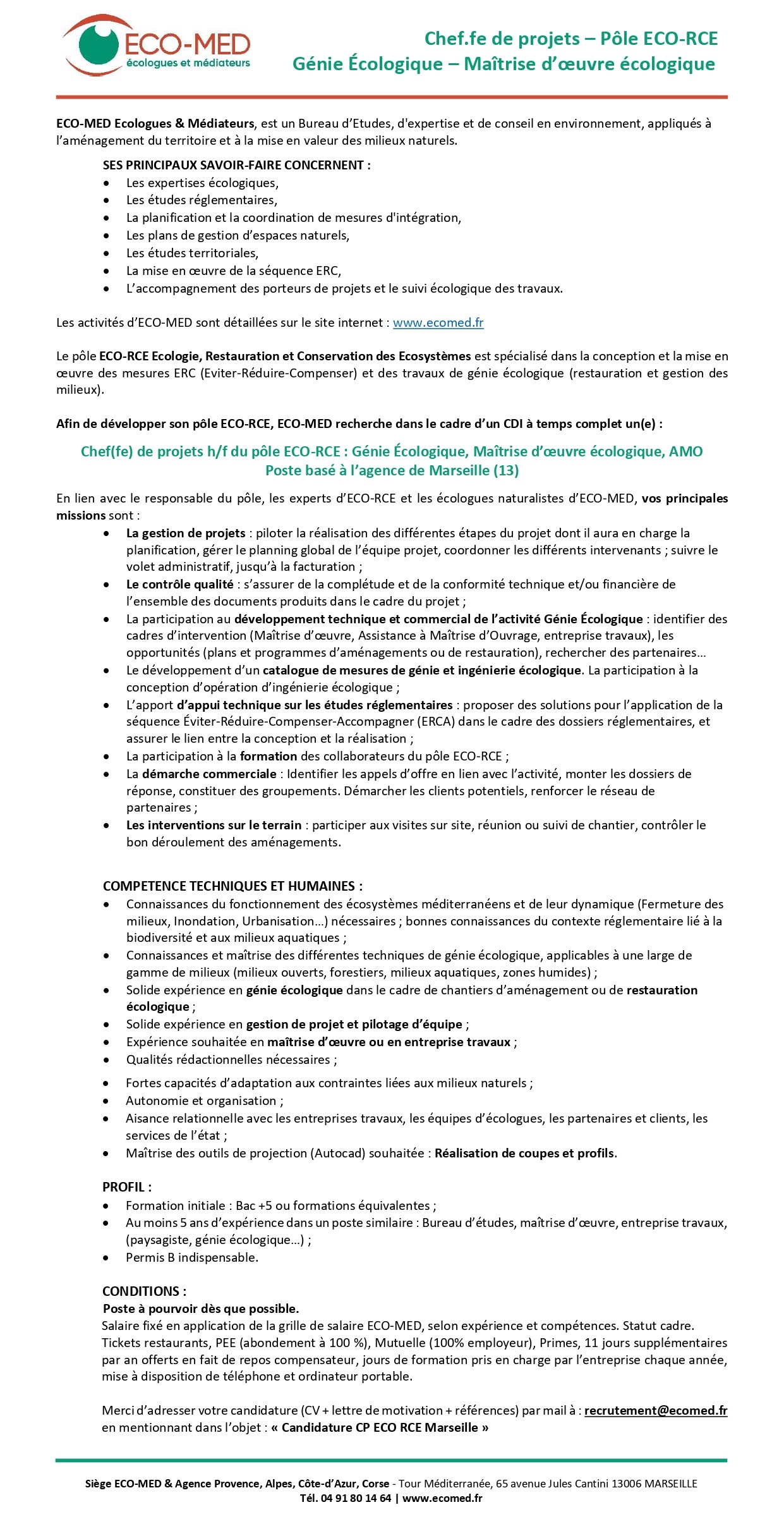 CHEF(FE) DE PROJETS DU PÔLE ECO-RCE – F/H : GENIE ECOLOGIQUE, MAITRISE D’OEUVRE ECOLOGIQUE, AMO – Poste basé à Marseille (13)