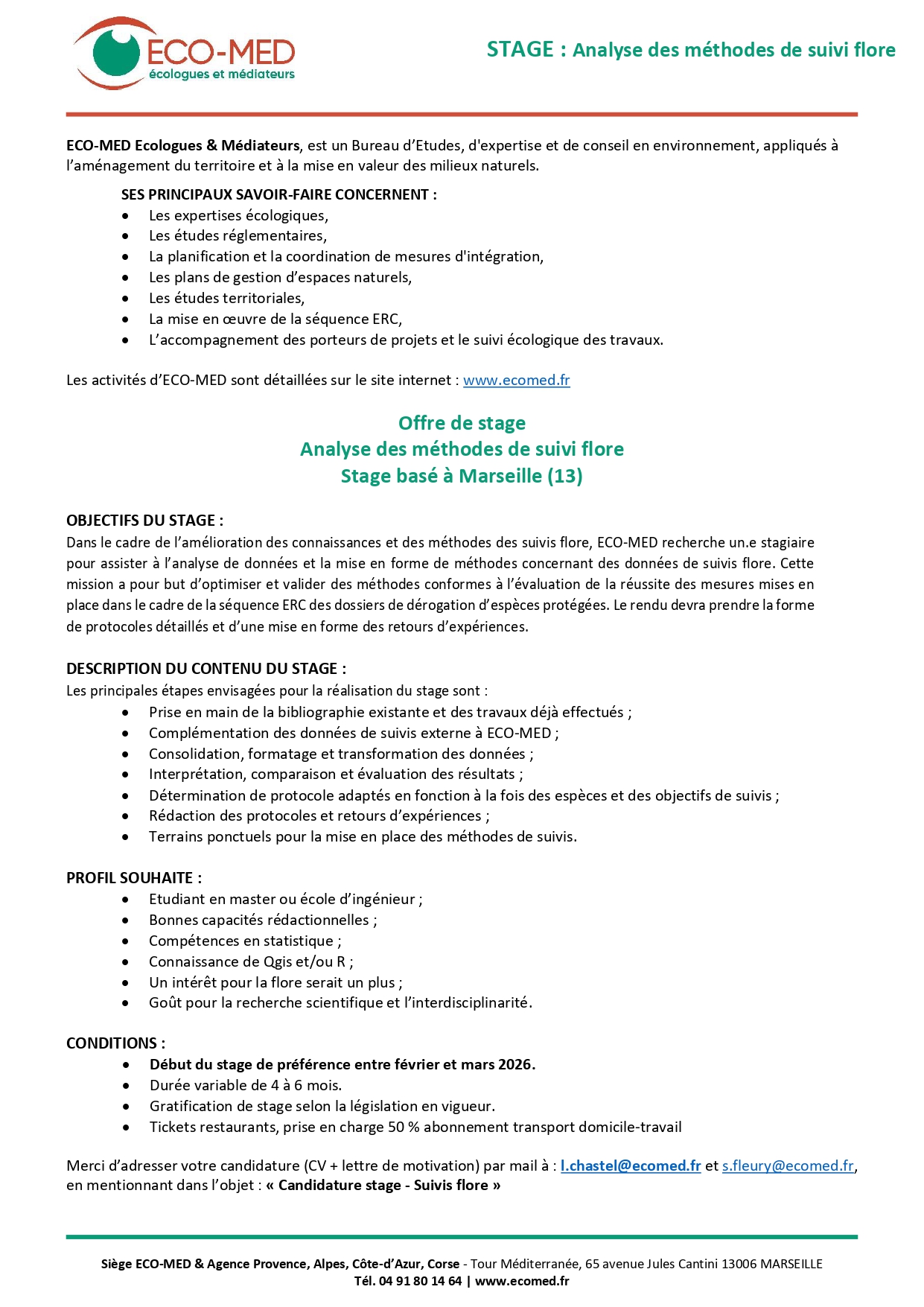Offre de stage – F/H – Analyse des méthodes de suivi flore – Stage basé à Marseille (13)