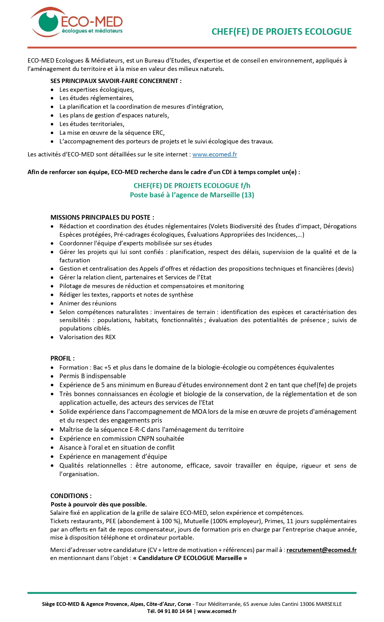 • CHEF(FE) DE PROJETS ECOLOGUE – CDI – F/H – Poste basé à Marseille (34)