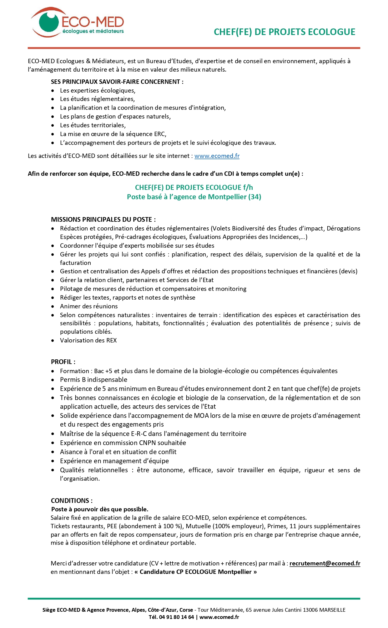 CHEF(FE) DE PROJETS ECOLOGUE – CDI – F/H – Poste basé à Marseille (34)