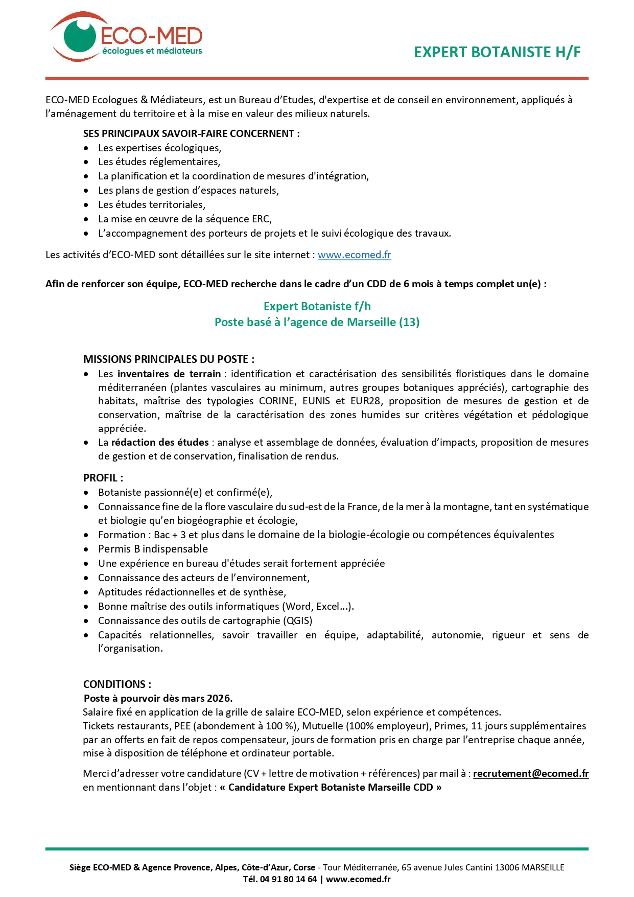 EXPERT BOTANISTE – CDD – F/H – Poste basé à Marseille (13)
