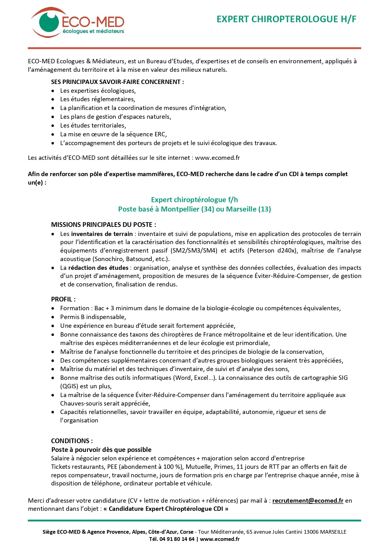 • CHEF(FE) DE PROJETS CHIROPTEROLOGUE – CDI – F/H – Poste basé à Montpellier (34) ou Marseille (13)