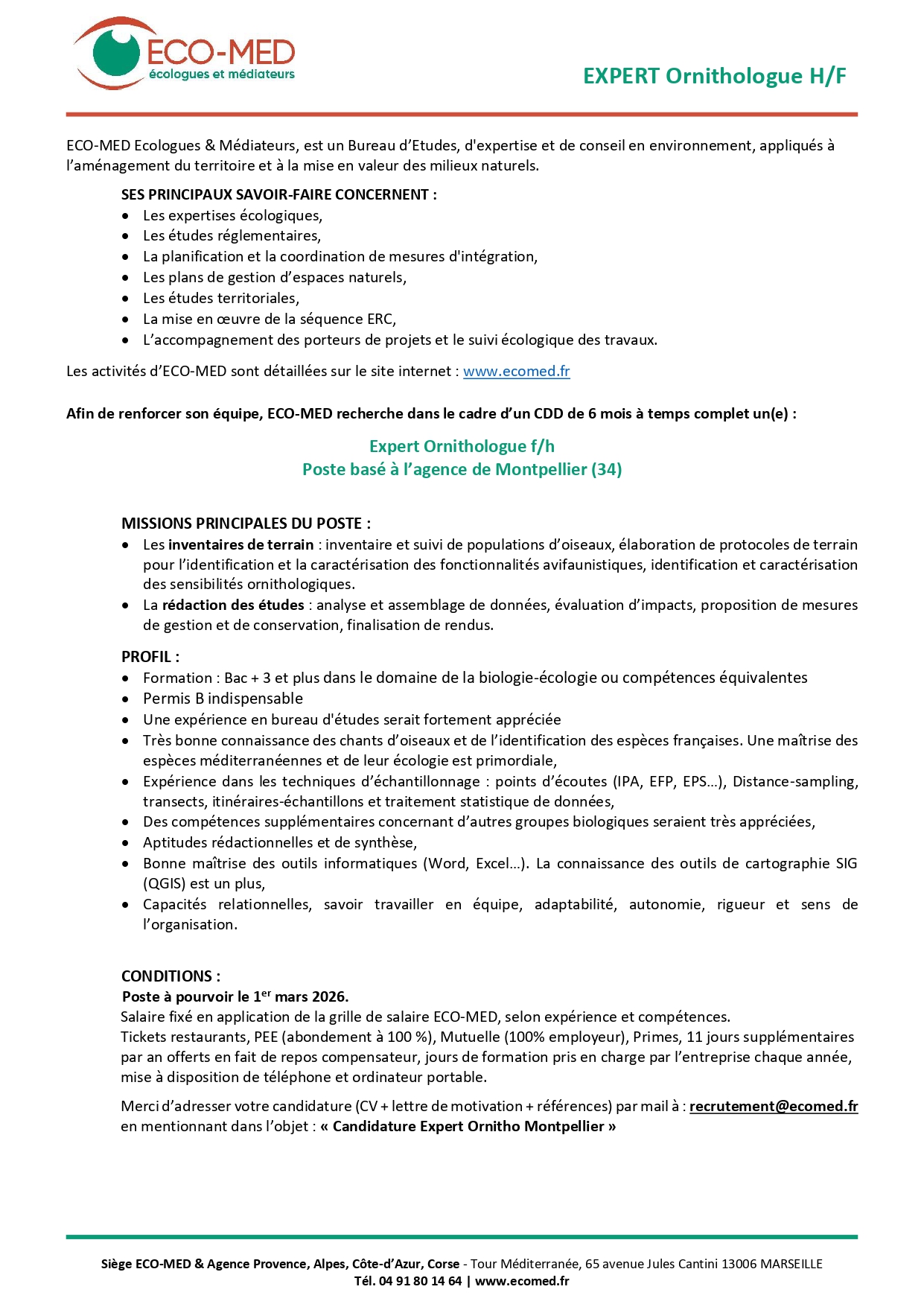 • EXPERT ORNITHOLOGUE – CDD – F/H – Poste basé à Marseille (13)